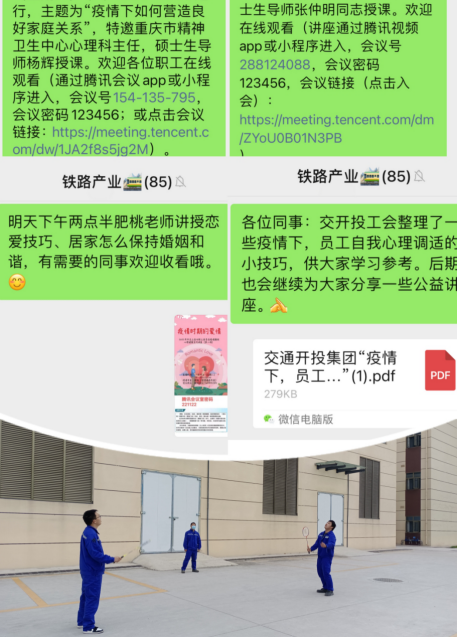 五是關(guān)心關(guān)愛職工,幫扶慰問暖人心。動(dòng)態(tài)掌握職工因疫致困情況,積極做好員工疏導(dǎo)和慰問幫扶工作,幫助困難職工3人;及時(shí)轉(zhuǎn)發(fā)緩解壓力、心理講座等相關(guān)視頻10余條;為一線人員購(gòu)置羽毛球拍,發(fā)放生活物資 4000余元,保障一線職工需要,豐富一線職工活動(dòng)。