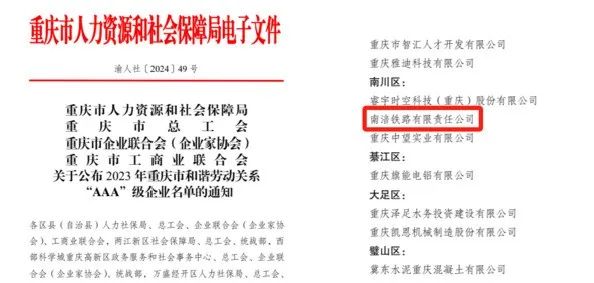 近日,重慶市人力資源和社會保障局、重慶市總工會、重慶市企業(yè)聯(lián)合會(企業(yè)家協(xié)會)、重慶市工商業(yè)聯(lián)合會發(fā)布了《關于公布2023年重慶市和諧勞動關系“AAA”級企業(yè)名單的通知》(渝人社〔2024〕49 號),表彰了一批有力維護和諧勞動關系、切實保障職工權(quán)益的優(yōu)秀企業(yè),市鐵路集團南涪鐵路公司榜上有名。