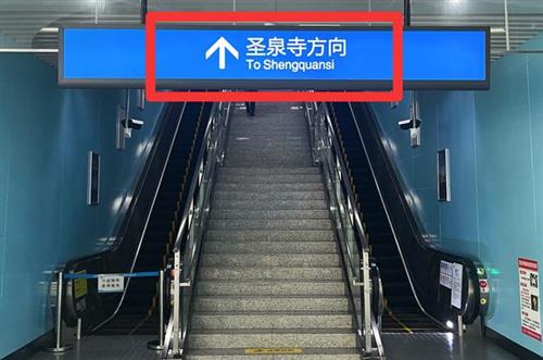 當(dāng)我們?cè)谡緩d搭乘扶梯上樓時(shí),頂部會(huì)有一塊這樣的藍(lán)色標(biāo)識(shí),上面寫(xiě)著某個(gè)站點(diǎn)的名字,代表從此側(cè)扶梯上去搭乘的就是往“XXX”方向的列車(chē)。