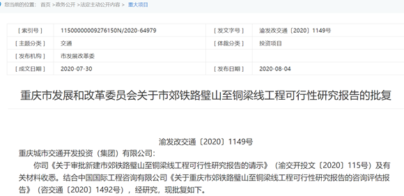 日前,重慶市發(fā)展和改革委員會發(fā)布關(guān)于市郊鐵路璧山至銅梁線工程可行性研究報(bào)告的批復(fù)。批復(fù)顯示,該項(xiàng)目估算總投資為86.42億元,線路全長37.35公里,設(shè)車站9座。